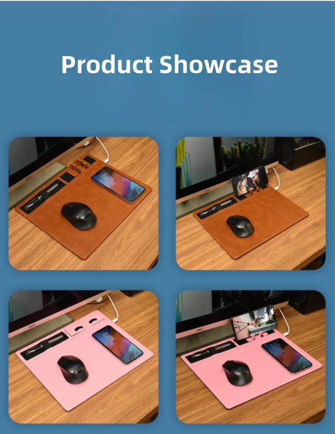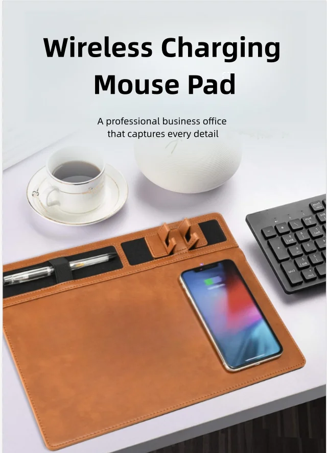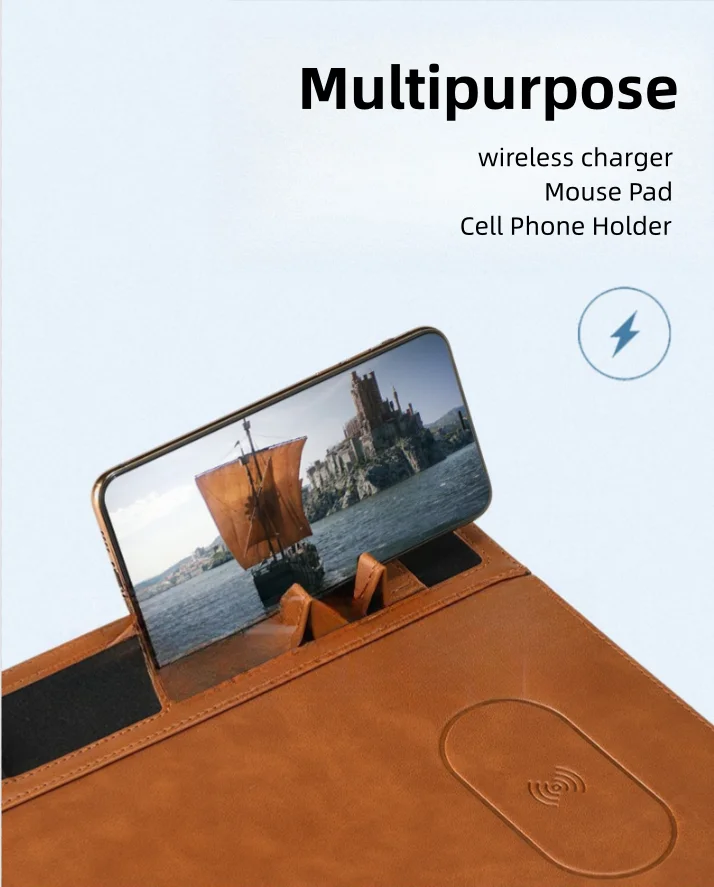 Upgrade your desk setup with our premium handcrafted leather mousepad. Combining elegant design with modern technology, this luxury desk pad features a built-in 15W fast wireless charger, allowing you to power up your smartphone or compatible devices effortlessly while you work or game.